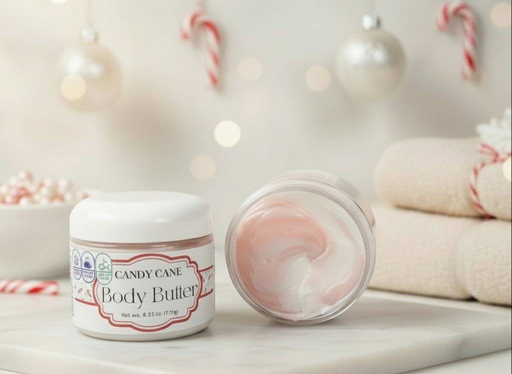 Body Butter - Water, Sunflower Seed Oil, Glycerin, Cetyl Alcohol, Shea Butter, Glyceryl Stearate, Panthenol (Pro-Vitamin B5), Cetearyl Alcohol, Sodium Stearoyl Lactylate, EO and Fragrance Blend or Fragrance (except unscented option), Vitamin E, Benzyl Alcohol, Allantoin, Mica, Benzoic Acid, Dehydroacetic Acid